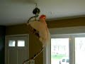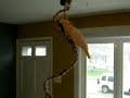 Description: Romeo the Moluccan cockatoo swinging on his boing after his shower |